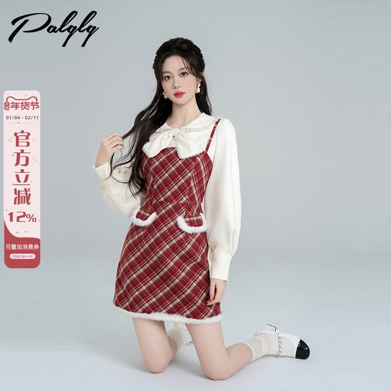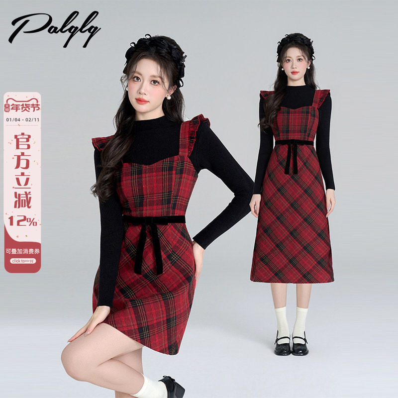 Palglg圣诞穿搭红色格子吊带连衣裙女冬季毛边法式收腰a字打底裙