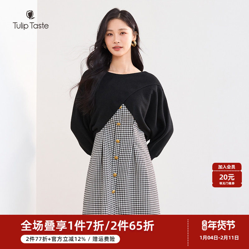 秋冬季裙子女法式气质针织打底衫收腰紫色格子吊带连衣裙两件套装