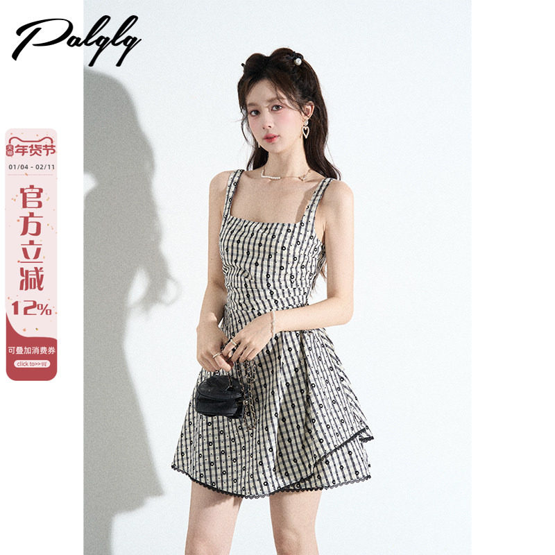 pusumede「格纹漫舞」格子吊带连衣裙女不规则雪纺气质碎花裙子