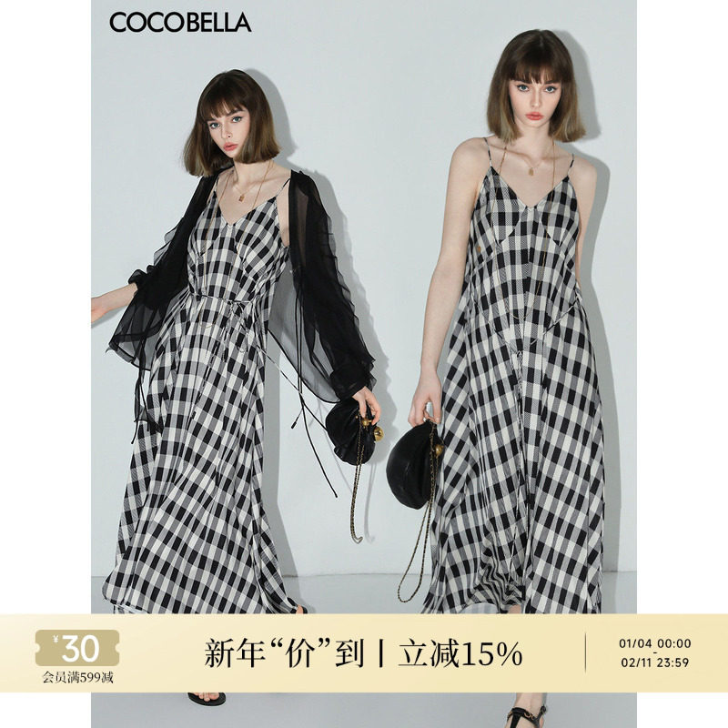 COCOBELLA垂坠黑白格子吊带长裙飘逸大摆海边度假连衣裙FR105