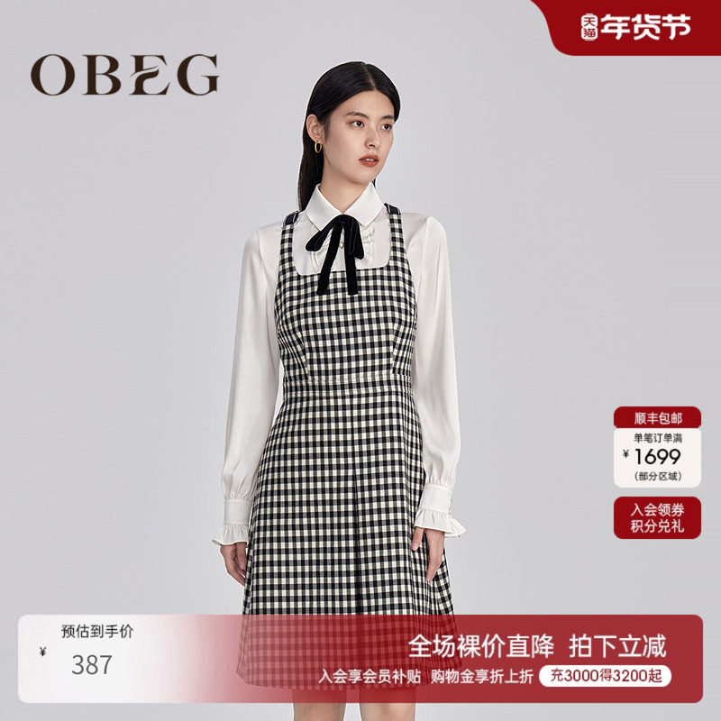 OBEG欧碧倩复古格子羊毛吊带连衣裙冬法式气质背心裙10444064