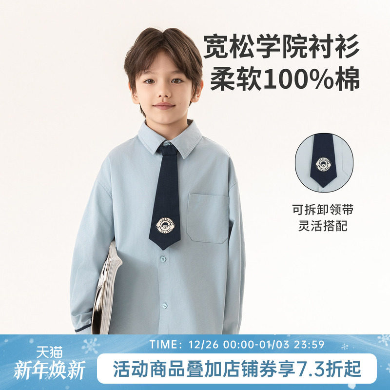 戴维贝拉男童纯棉衬衣儿童衬衫2025秋季新款男大童学院风蓝色上衣