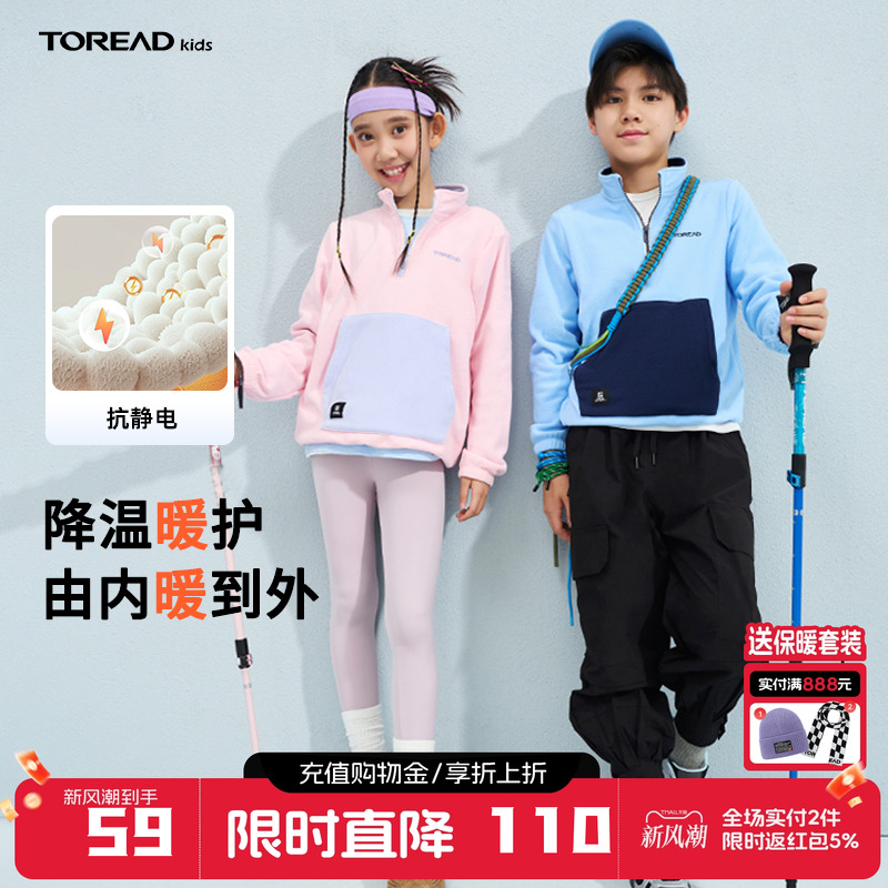 探路者儿童抓绒服2025新款秋冬男女打底加绒防静电保暖百搭外套