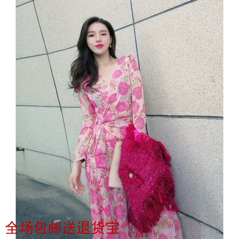 刘美人2025春夏女法式气质太阳花碎花连衣裙女V领高腰长袖chi长裙