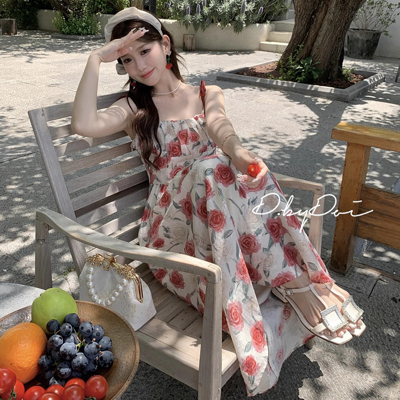 冷艳美人氛围感 ROUJE KORA 法式浪漫油画红玫瑰印花吊带连衣裙夏