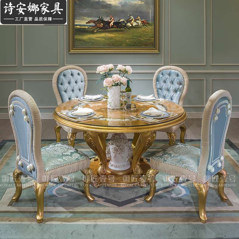 欧式餐桌椅组合6人8人 大理石圆桌带转盘家用实木法式圆形吃饭桌