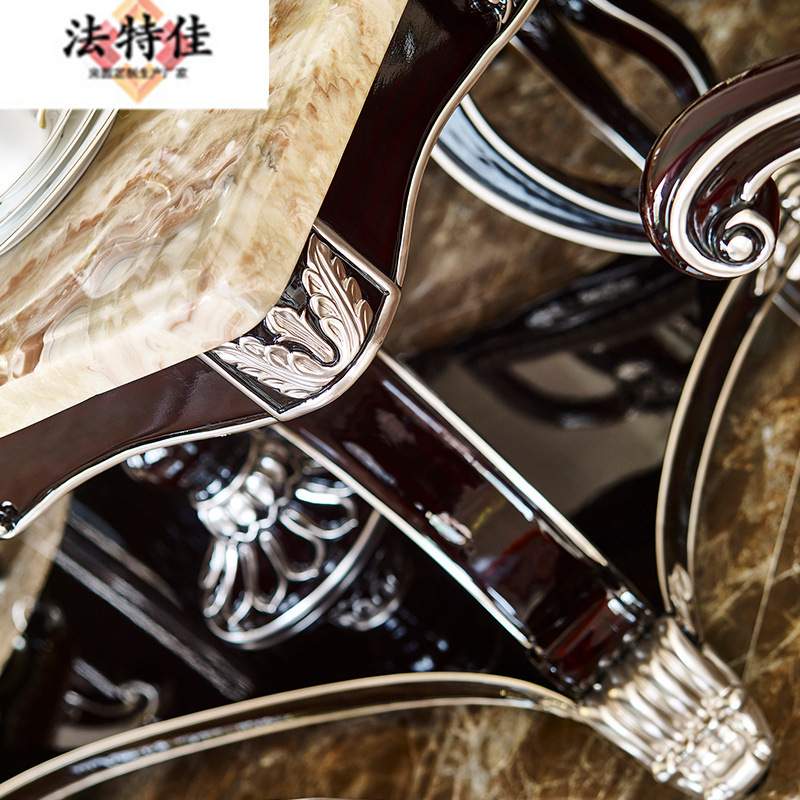 欧式大理石餐桌椅组合新古典红檀色实木雕花客厅6-8人吃饭圆餐桌