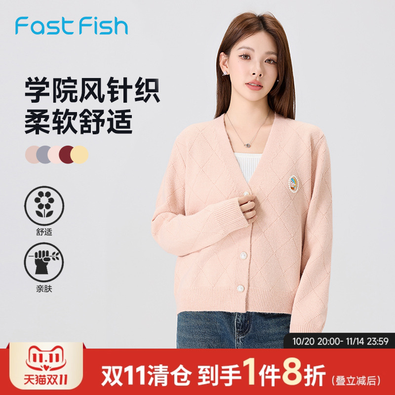 快鱼刺绣针织衫女士2025春季新款学院风百搭简约彩色通勤开衫毛衣
