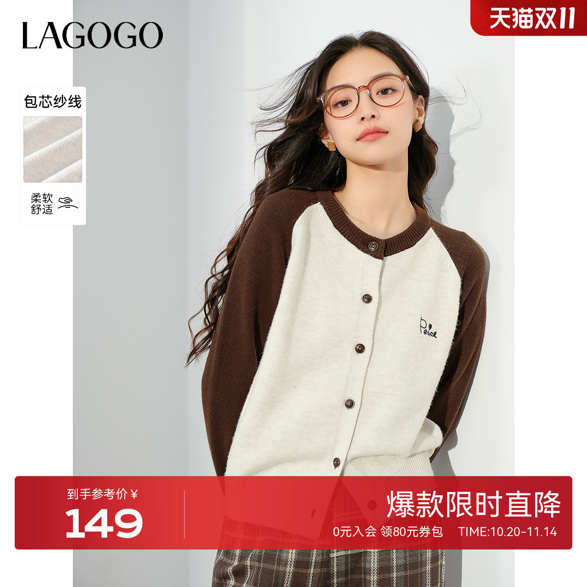 LAGOGO插肩袖刺绣针织衫女拉谷谷春秋新款圆领学院风针织开衫