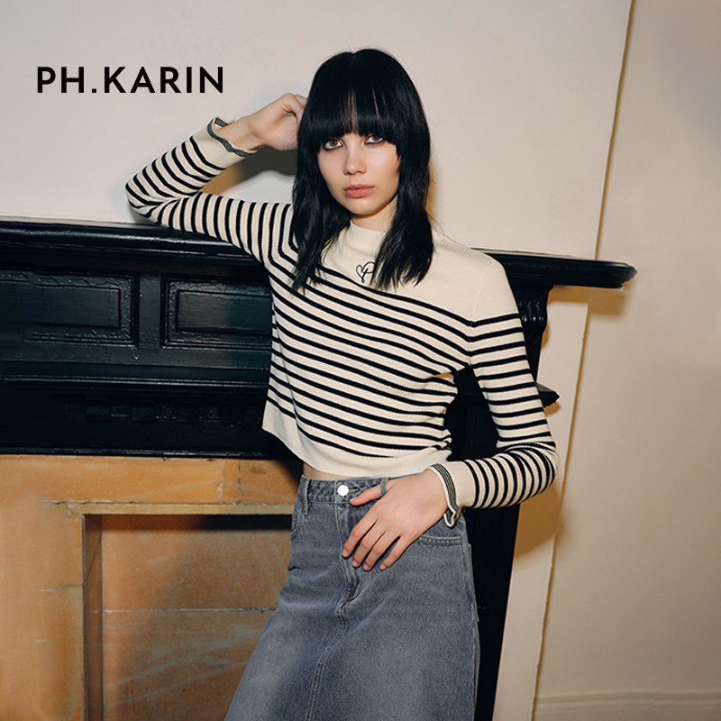 PH KARIN短款复古条纹刺绣针织衫女长袖打底松弛感春秋软糯上衣