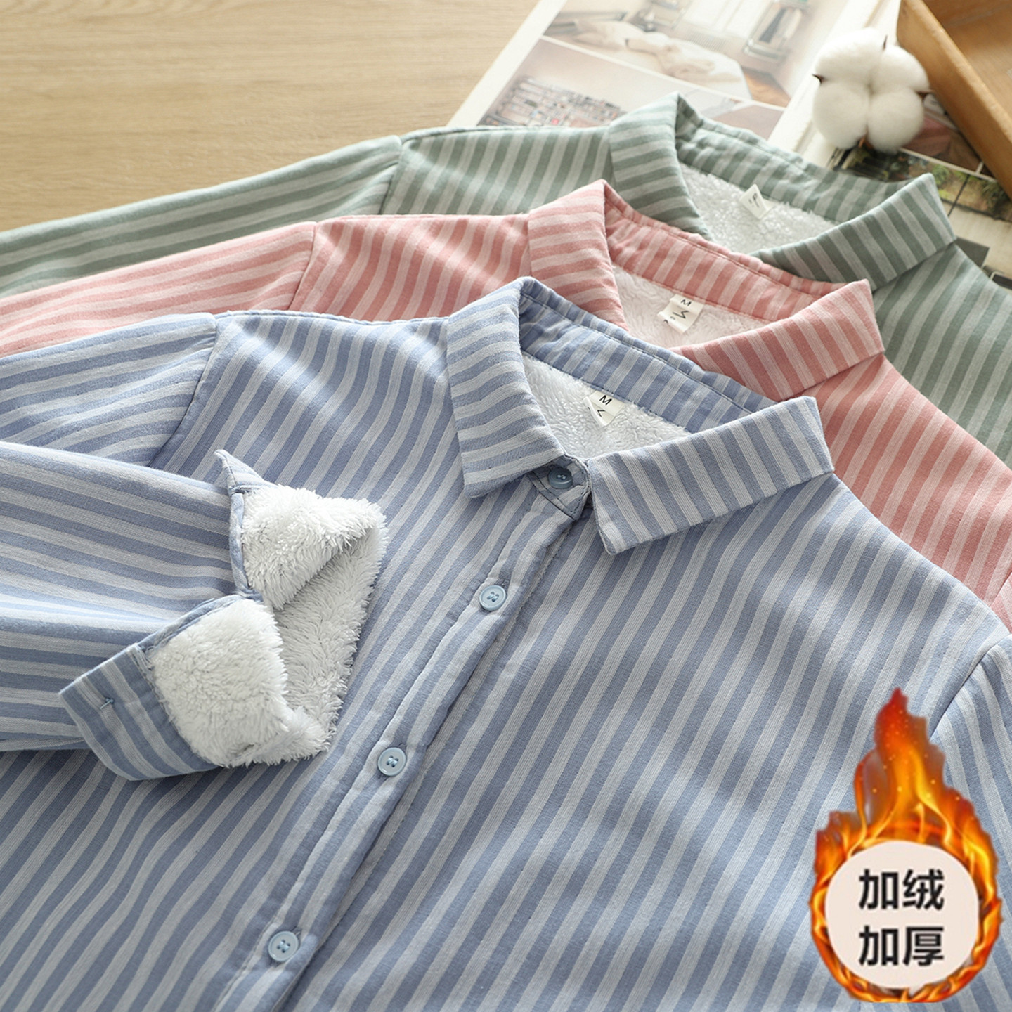 2025冬季韩范小清新竖条纹纯棉加绒加厚衬衫女长袖打底衫通勤上衣