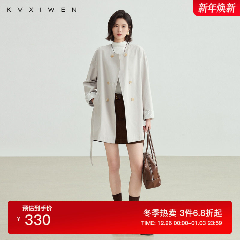 织物猪 轻咖布雷 学院风卡其色拼接风衣女秋气质感中长款大衣外套