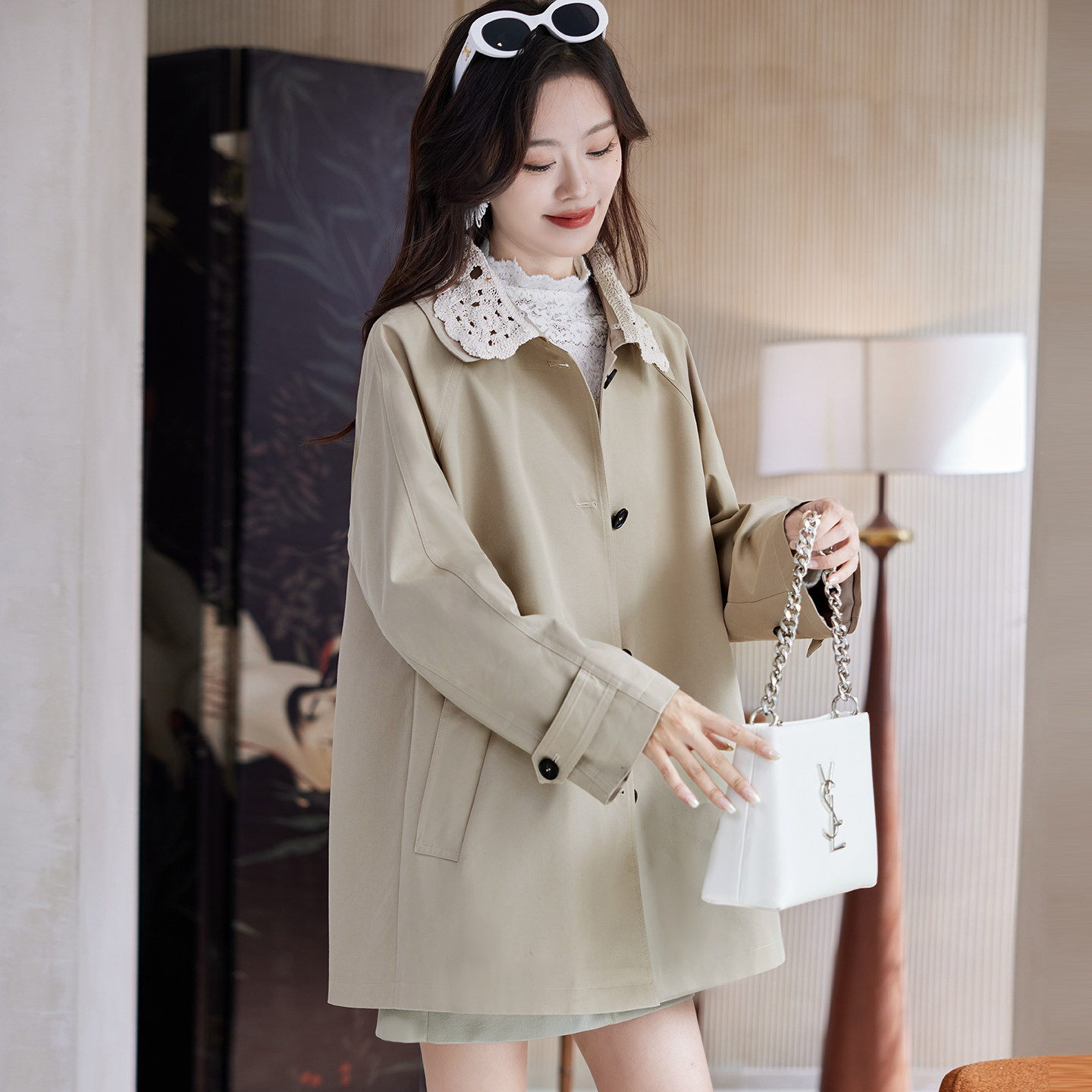 宝诗黎翻领蕾丝拼接风衣外套2026春季韩系简约休闲宽松大码女装