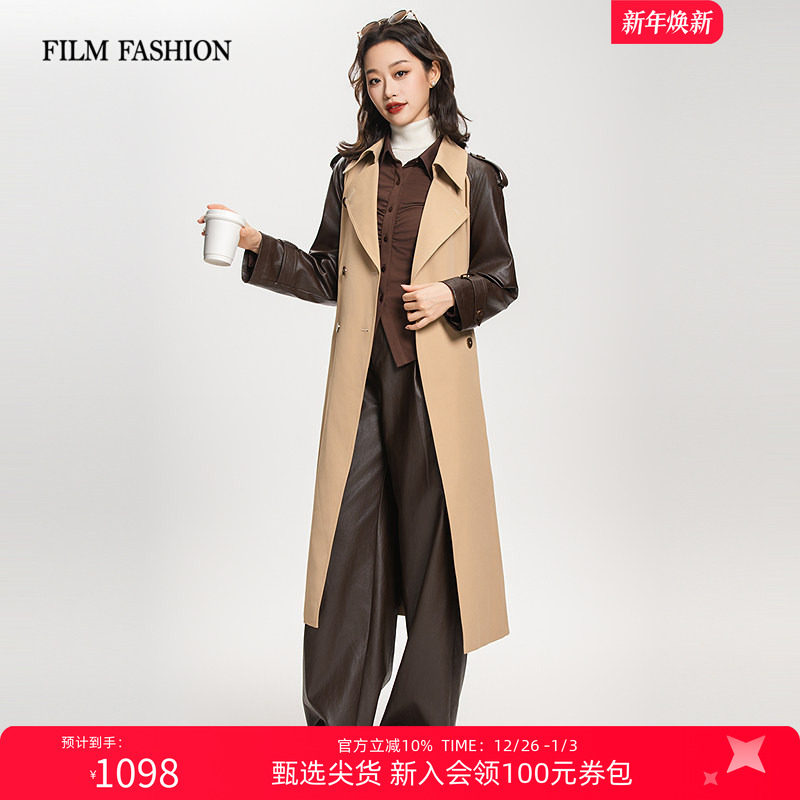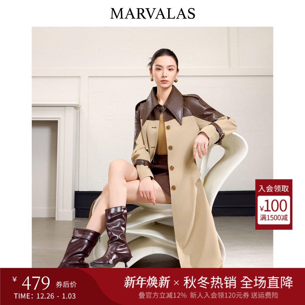 曼德诗蛋白皮拼接风衣2025秋季新款美拉德撞色拼皮工艺气质长外套