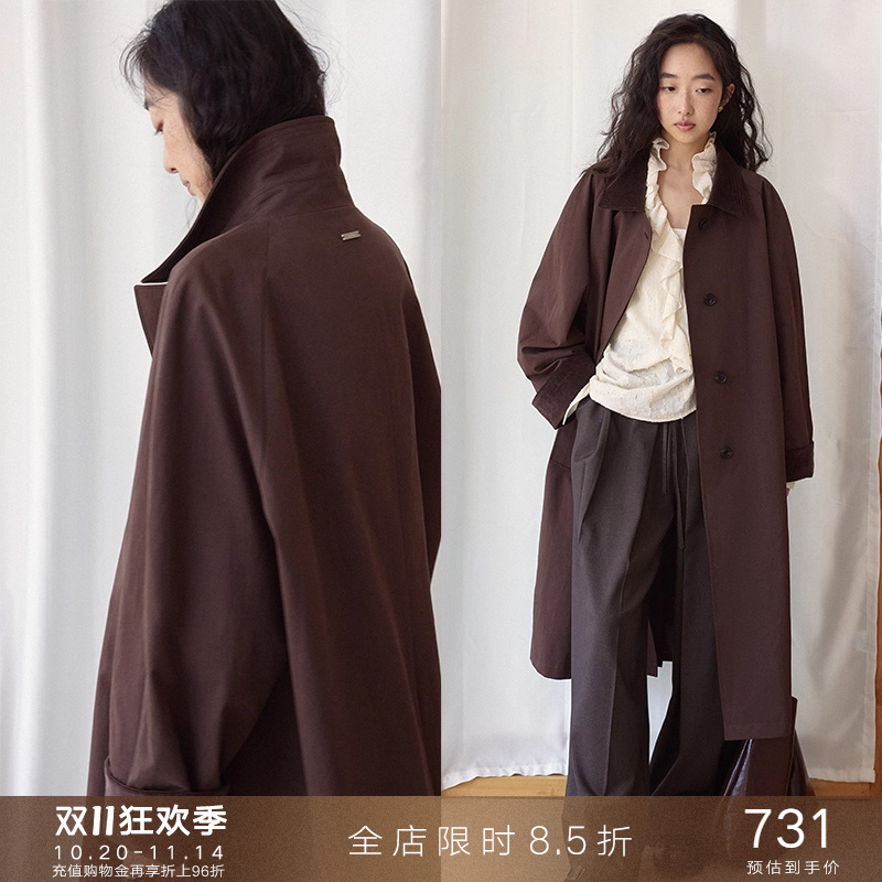 画风drawwind拼接翻领风衣女2025秋冬新品宽松韩版通勤风拼色外套