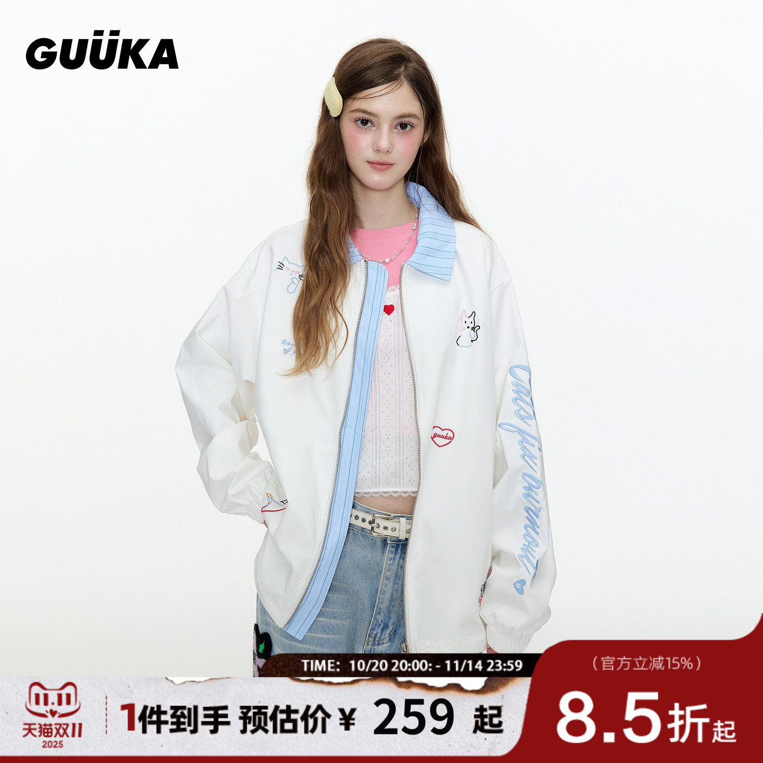 GUUKA潮牌白色猫咪刺绣翻领夹克男秋季 撞色拼接风衣正肩外套合身