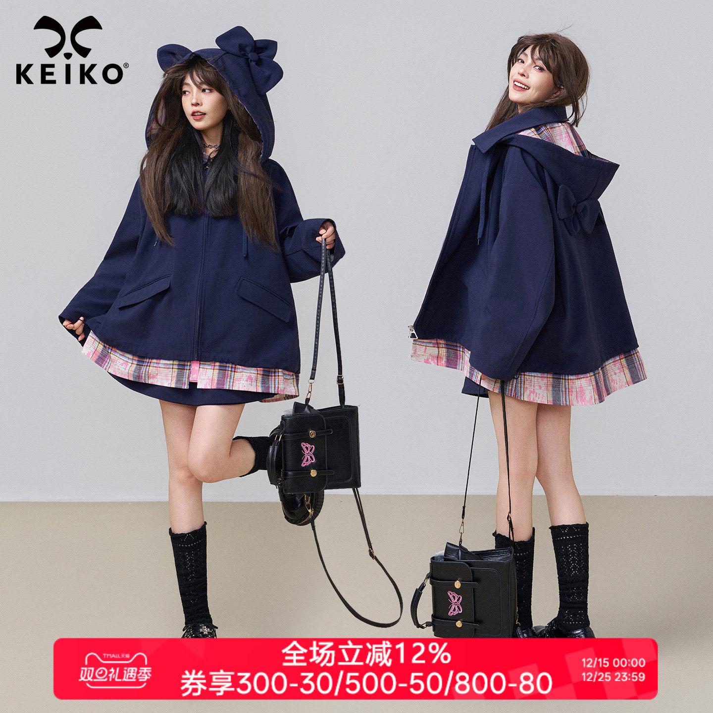 KEIKO [高密/防水] 可卸连帽藏青色外套女26春季韩系格纹拼接风衣