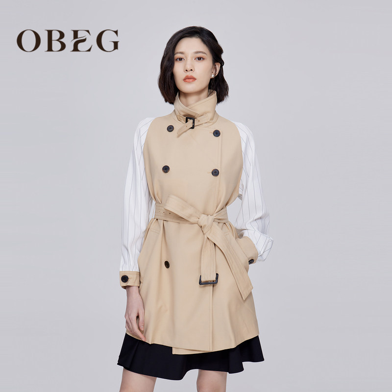 OBEG欧碧倩奥莱特卖秋收腰气质时尚条纹拼接风衣外套女10421053