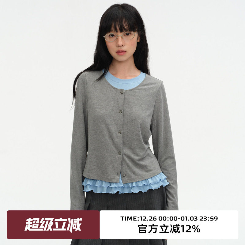 omont蛋挞家复古假两件荷叶边下摆长袖T恤2025秋圆领慵懒宽松上衣