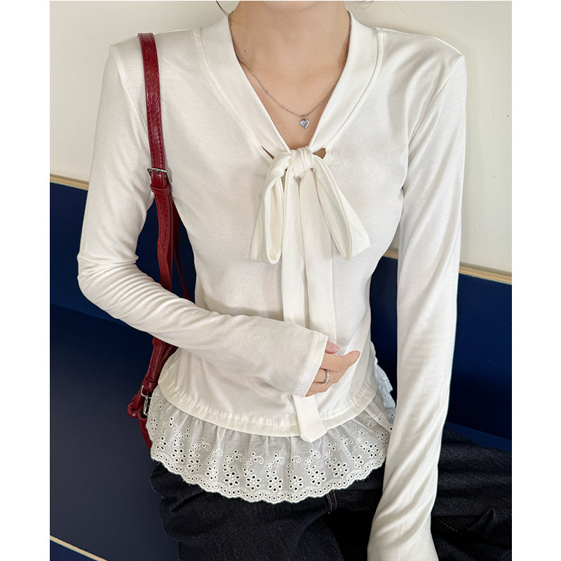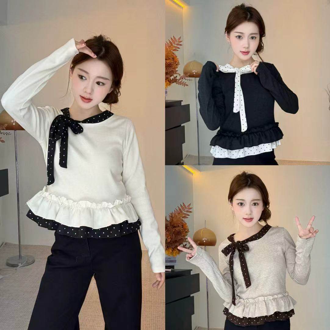 小个子假两件拼接波点荷叶边下摆长袖蝴蝶结打底衫设计感上衣603