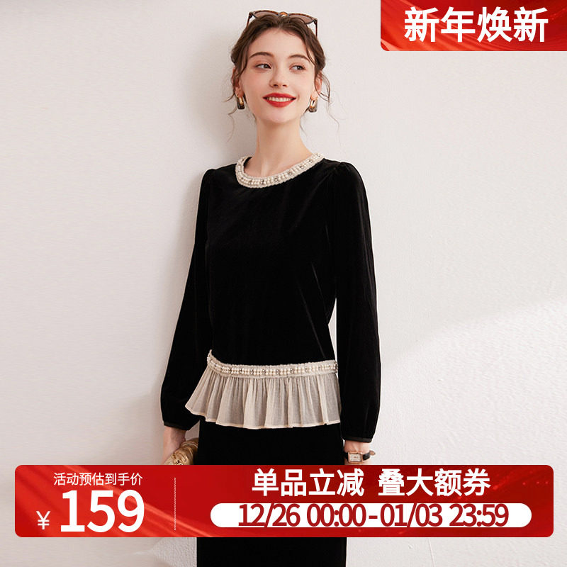 白鹿语钉珠丝绒上衣25秋时尚微弹圆领荷叶边下摆长袖女式花边衬衫