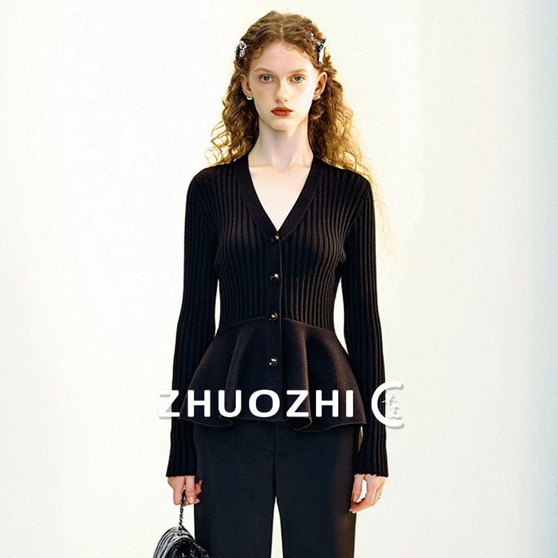【爆款】卓芝法式荷叶边下摆针织衫2025早秋新款高级感v领上衣女