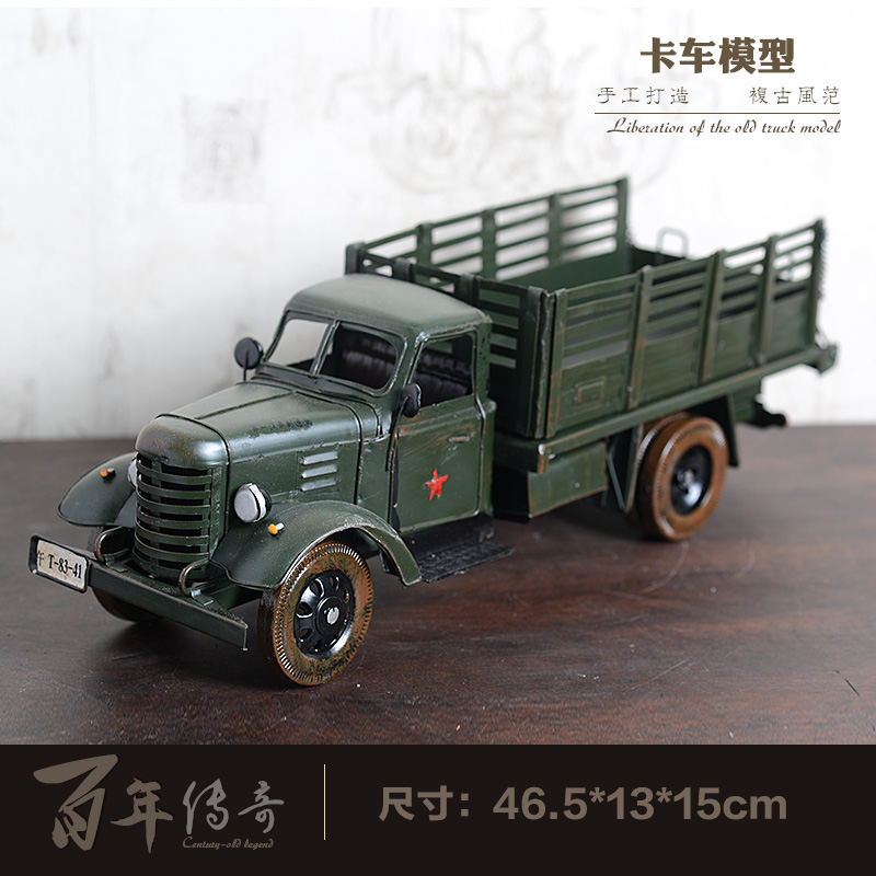 中国老式解放卡车模型复古铁皮老爷车摩托车军车摆件家居橱窗道具