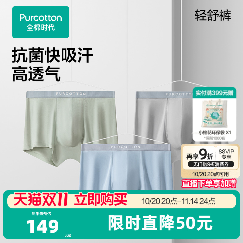 【双11现货】全棉时代男士全棉透气抗菌内裤平角四角轻薄舒爽抗皱