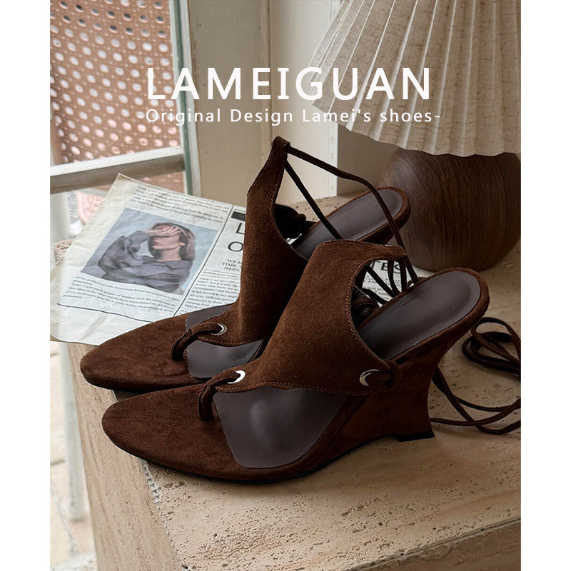 性感咖色夹趾坡跟绑带凉鞋女2026夏季新款复古欧美增高露趾高跟鞋