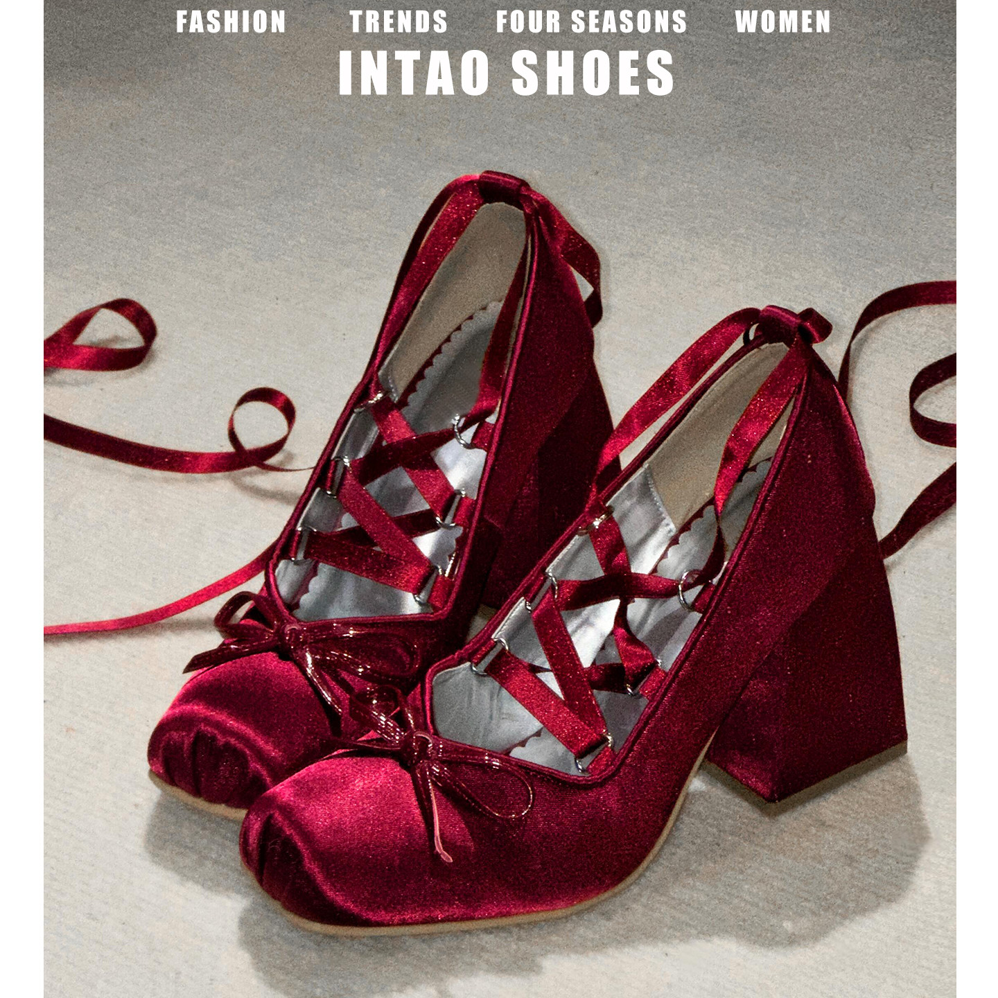 红色缎面蝴蝶结交叉绑带高跟鞋女粗跟2026春季新款优雅lolita单鞋