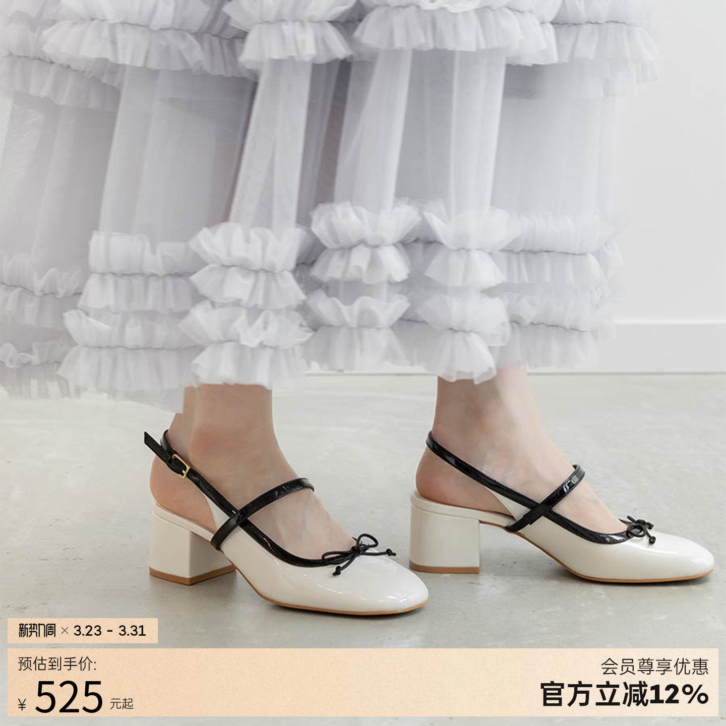 RANDA 26春夏新款漆皮亮面优雅后绑带粗跟方头高跟单鞋女 PD37275
