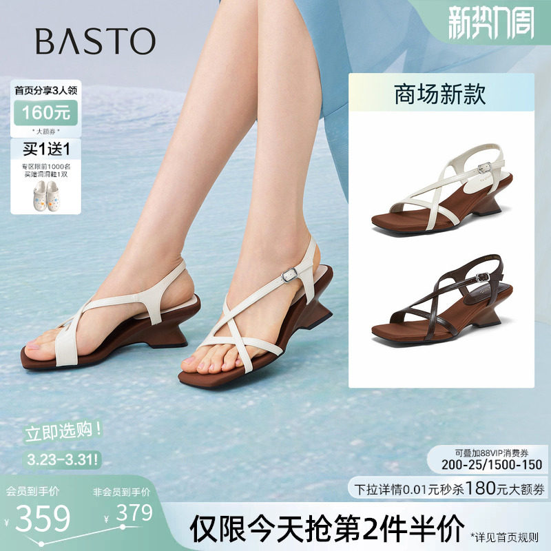 MILLIE'S/妙丽方头坡跟法式超高跟交叉绑带显气质时尚罗马凉鞋女
