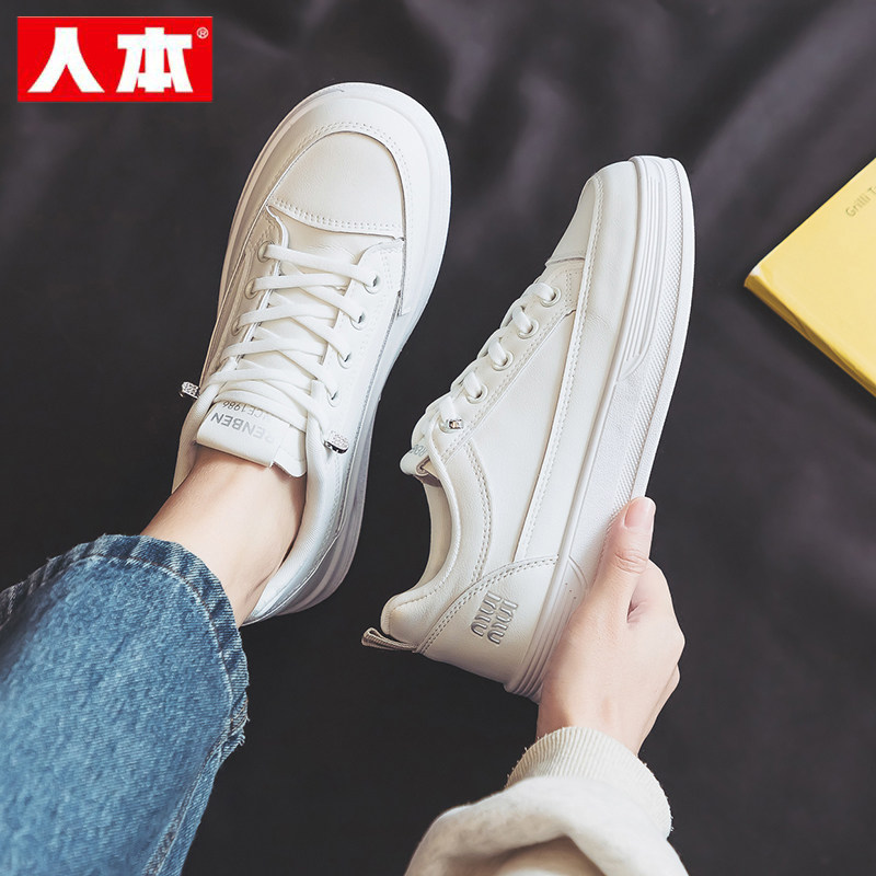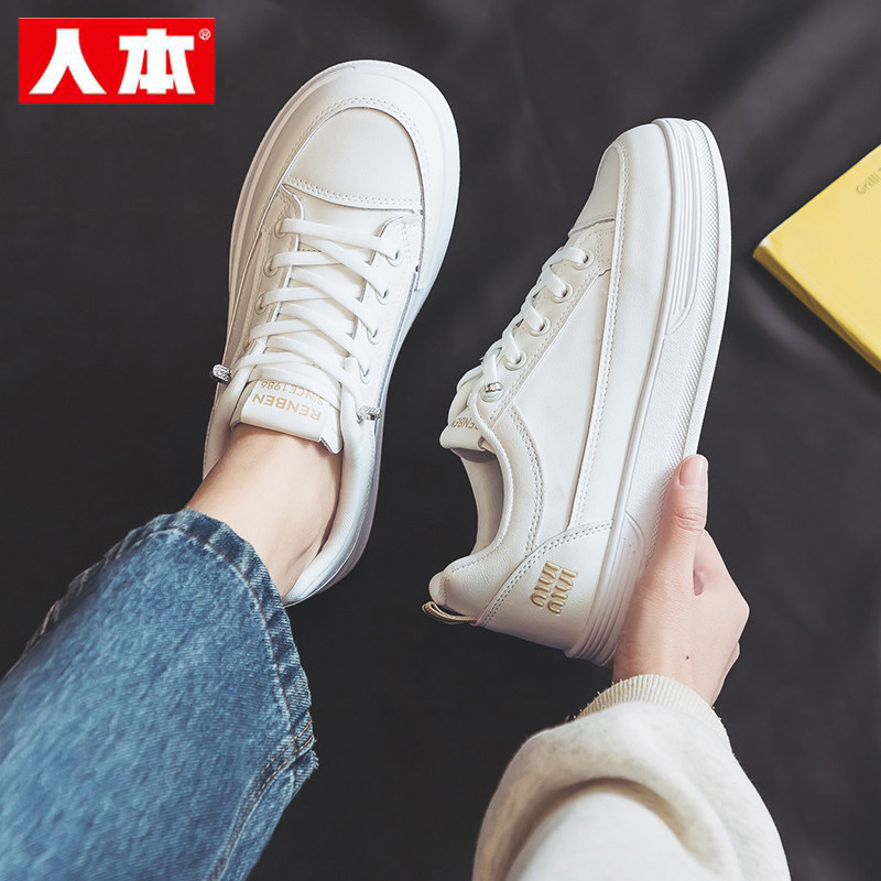人本休闲风皮面白色低帮小白鞋女百搭系带学生平底板鞋舒适运动鞋