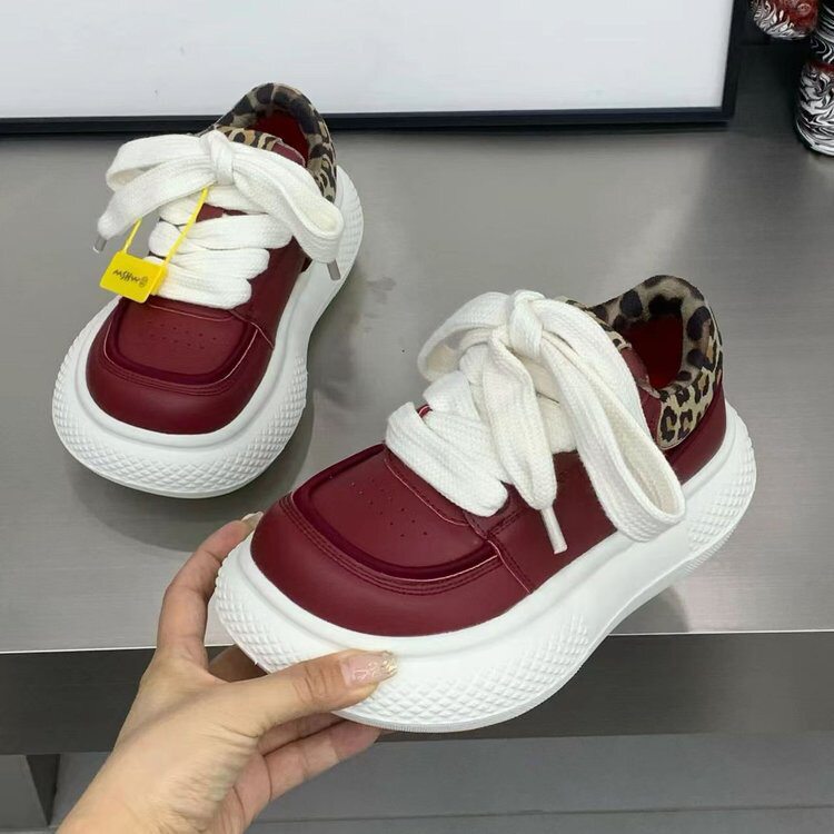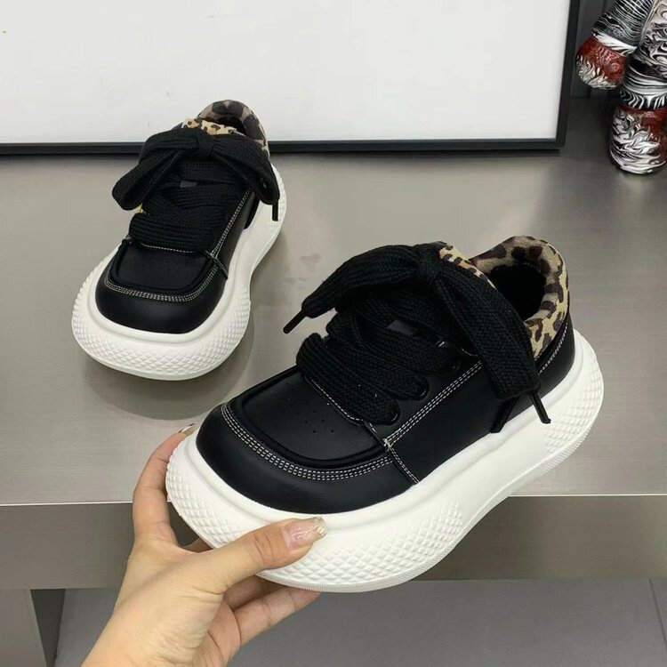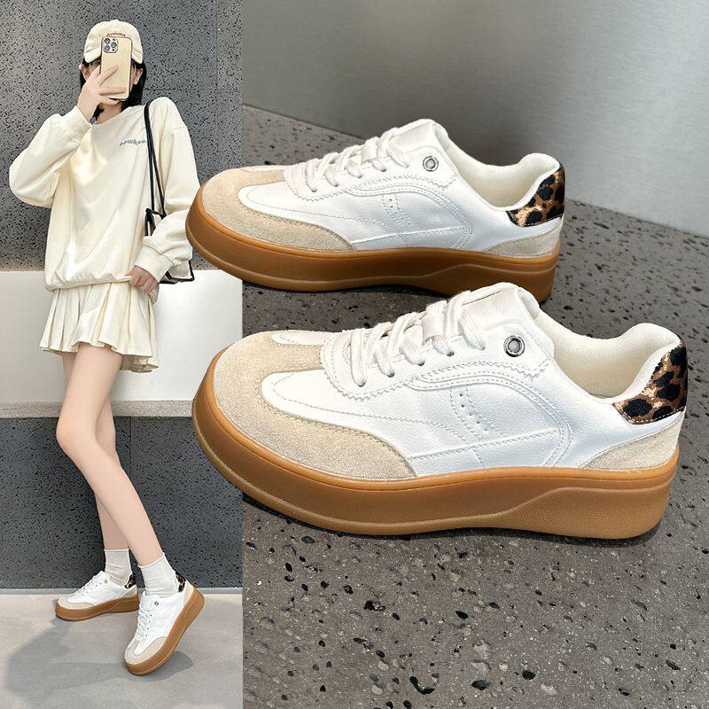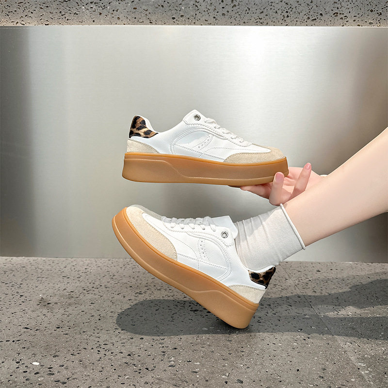 2026春季新品豹纹皮面小白鞋女韩版厚底拼色德训鞋女系带休闲鞋女