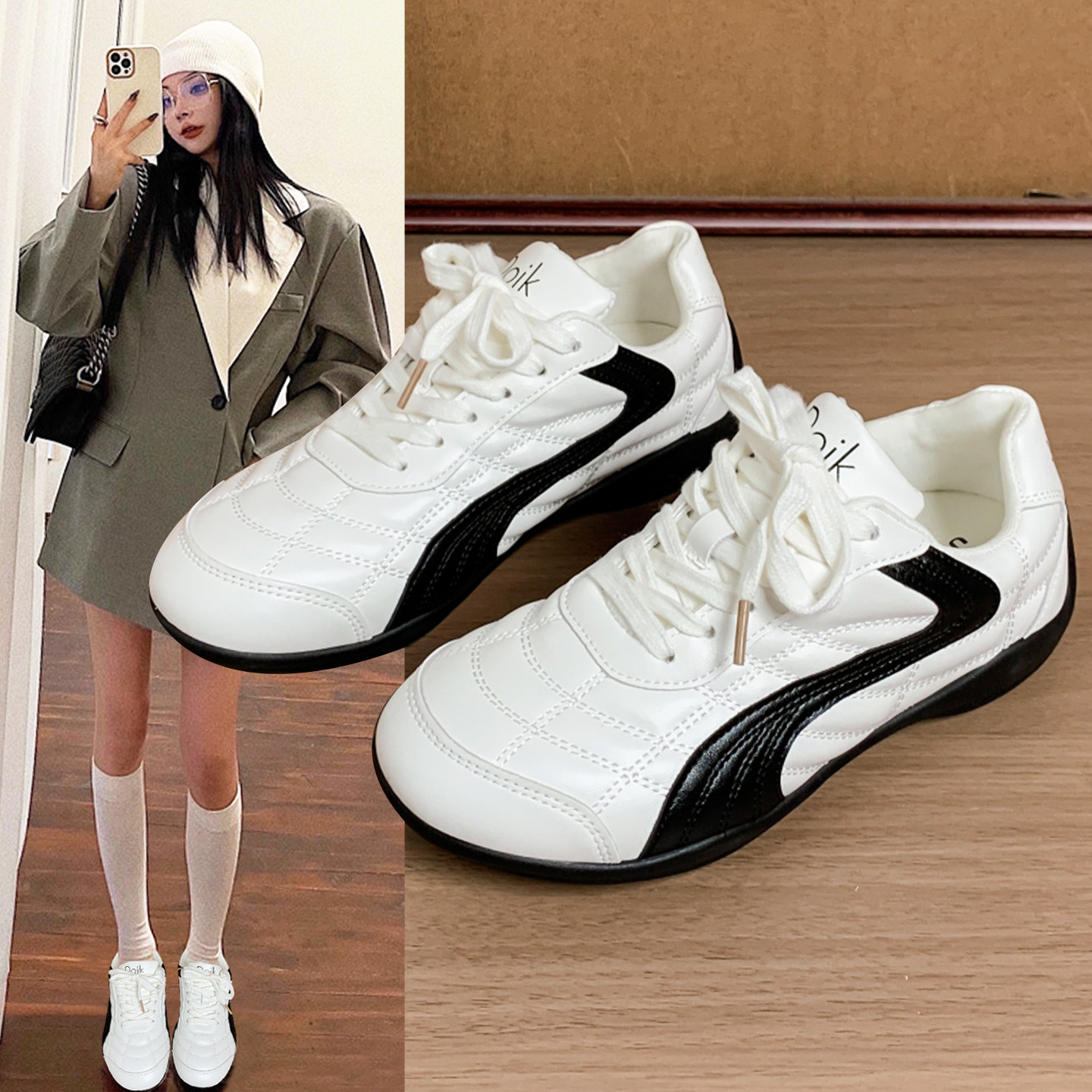 复古皮面德训鞋女202春季新款白色拼色系带休闲运动鞋百搭小白鞋
