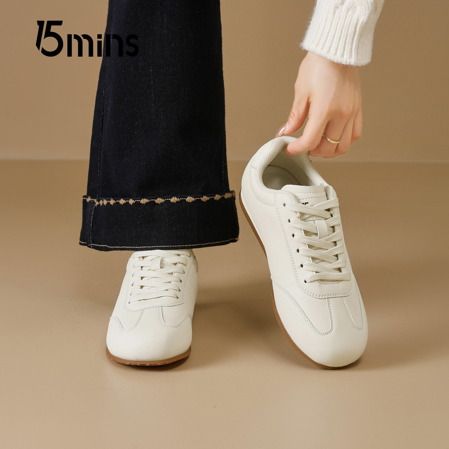 15mins皮面德训鞋女2026春季新款百搭系带小白鞋轻便软底休闲板鞋