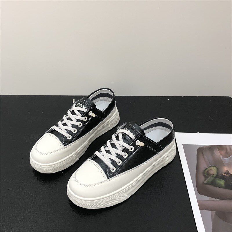 小白鞋女鞋2023新款秋季黑白皮面板鞋厚底免系带一脚蹬踩脚休闲鞋
