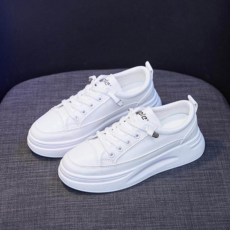 康莉免系带小白鞋女春秋新款皮面轻便百搭简约运动鞋松糕休闲板鞋