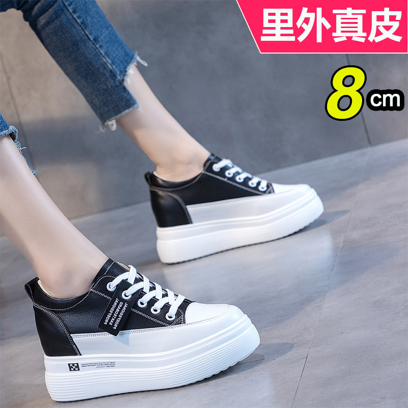 全真皮厚底内增高小白鞋女8CM皮面系带板鞋春秋季网面透气休闲鞋