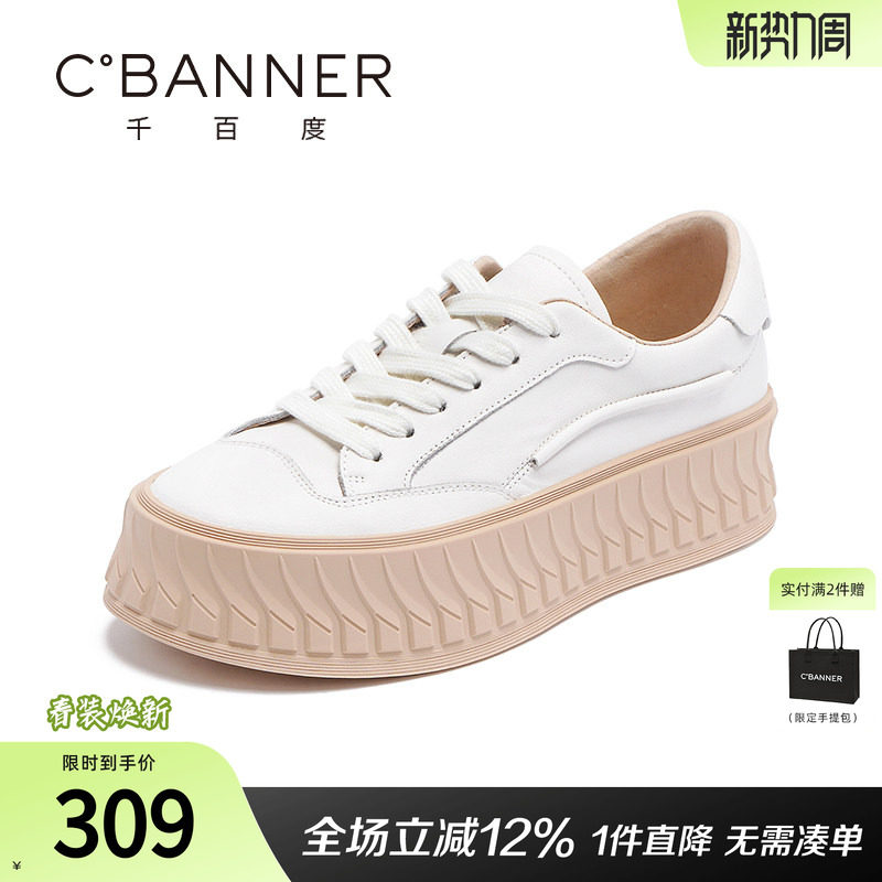 千百度休闲鞋女系带松糕新款厚底增高小白鞋百搭皮面舒适运动板鞋