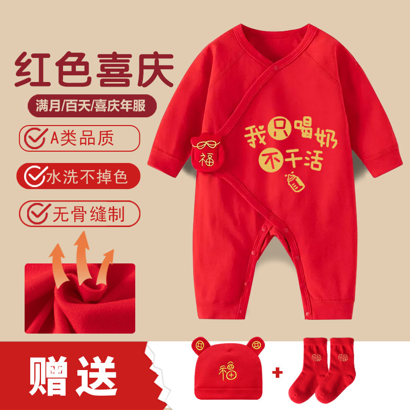 宝宝衣服春季满月服喜庆百天红色新年服春秋新生儿纯棉婴儿连体衣
