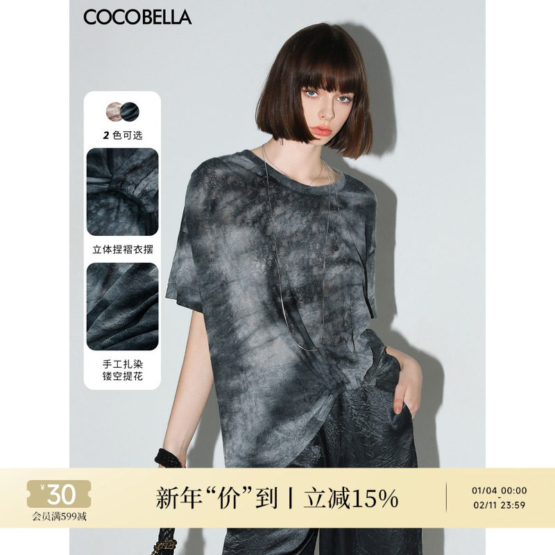 COCOBELLA手工扎染渐变镂空提花短袖针织衫捏褶晕染印花T恤TS7020