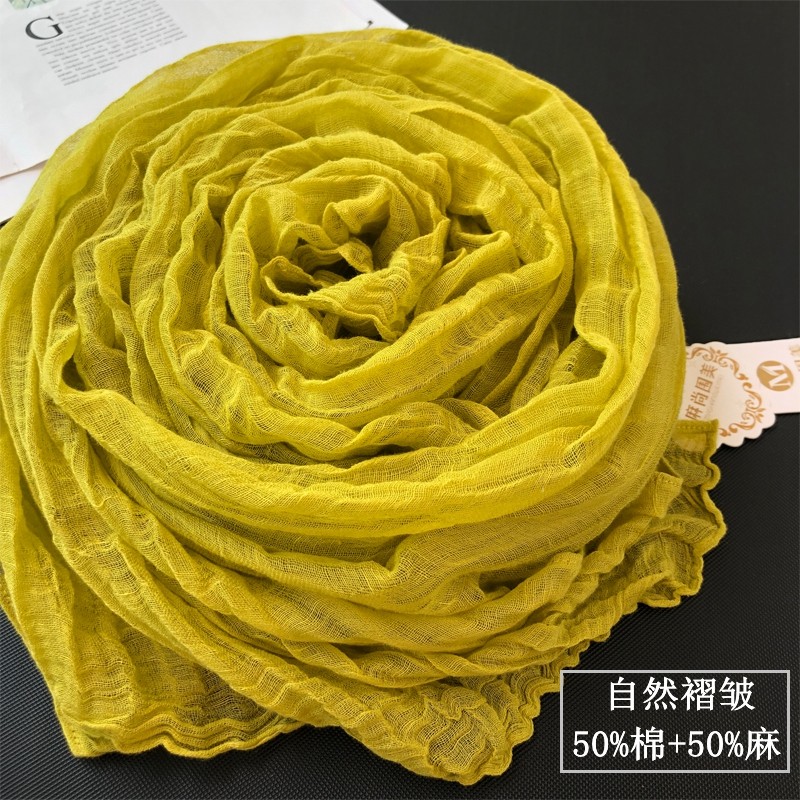 姜黄色棉麻苎麻围巾女薄款春秋季长款百搭文艺褶皱大披肩亚麻丝巾