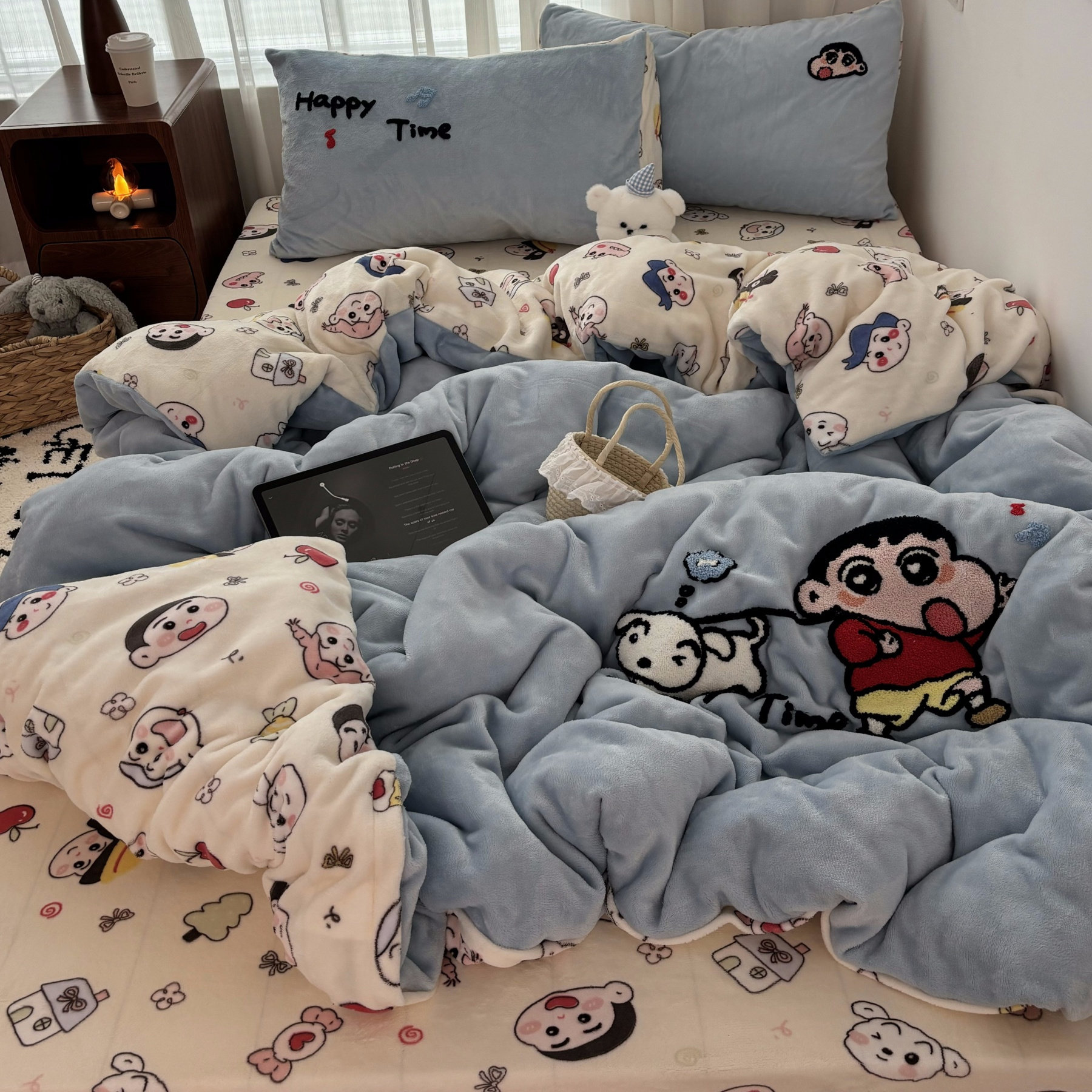 卡通ins可爱小新毛巾绣牛奶绒床单四件套珊瑚绒被套保暖三件套1.5