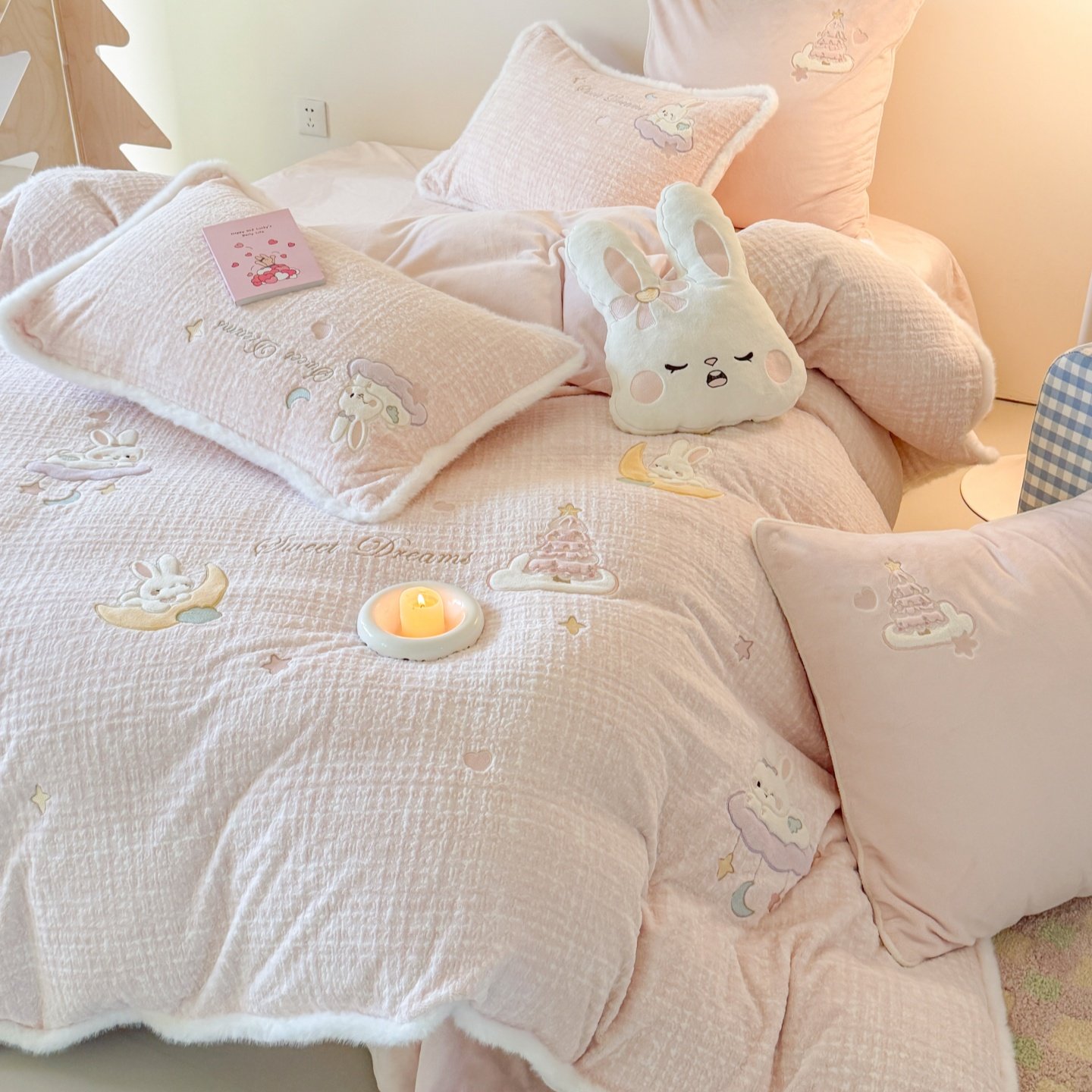 少女心卡通牛奶绒四件套可爱兔子刺绣保暖珊瑚绒冬季加厚被套床品