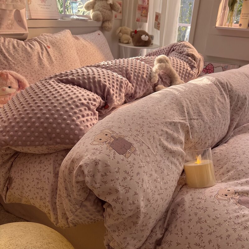 冬季少女可爱卡通加厚牛奶绒四件套珊瑚绒被套床单公主风床上用品