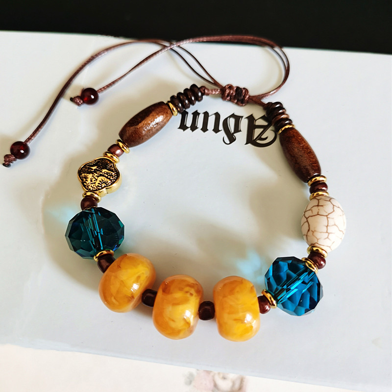 原创鸡油黄蜜蜡吊坠手链男女款手工编织水晶琥珀手串饰品复古蜡绳