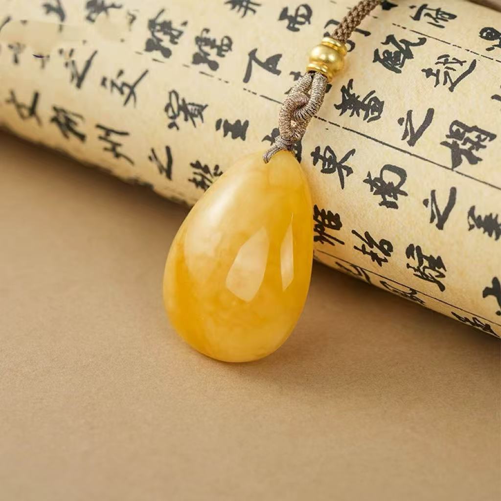 琥珀老蜜蜡吊坠女款毛衣链长款秋冬水滴项链男士鸡油黄无事牌挂坠