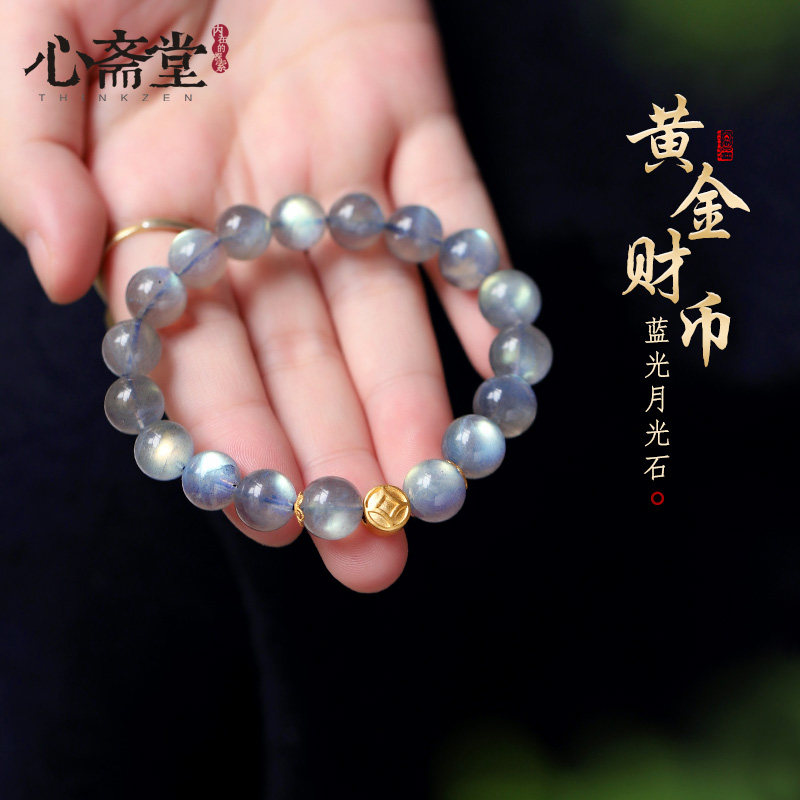 心斋堂【一息】天然蓝光月光石手串女净体灰月光999足金钱币手链