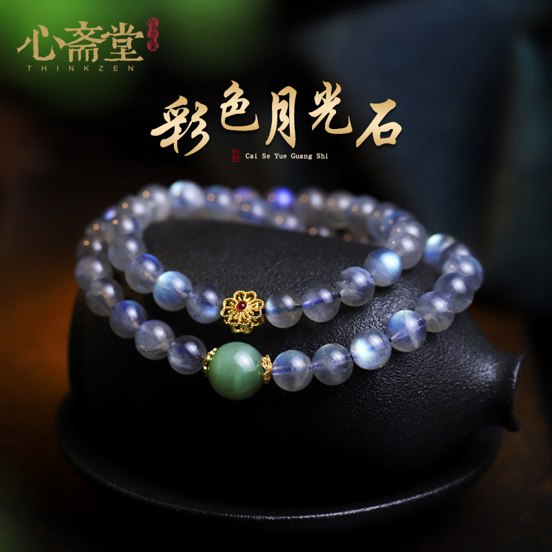 心斋堂【万年】玻璃体蓝月光石手链冰种强蓝光彩虹光水晶黄金手串